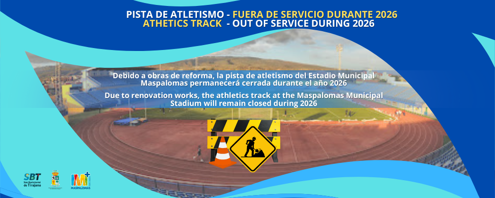 Se informa a todos los usuarios y clubes deportivos que la pista de atletismo del Estadio de Maspalomas permanecerá fuera de servicio durante el año 2026, hasta nuevo aviso, debido a obras de reforma y mejora de sus instalaciones.