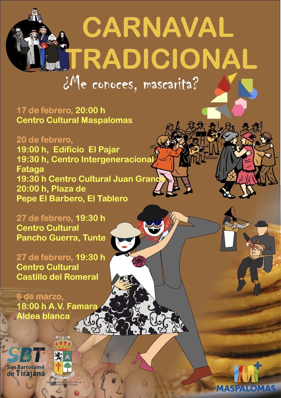 Todos los años, entre finales de febrero y mediados de marzo, Maspalomas Costa Canaria se viste de mil colores para celebrar su carnaval. Durante casi una semana, rondallas, murgas y comparsas recorren las calles del municipio dejando a su paso un ambiente de fiesta en general. Las calles se llenan de color y alegría, ejemplo de cordialidad y tolerancia.